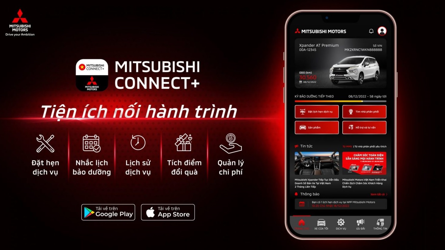 Để nâng tầm trải nghiệm chất lượng dịch vụ và chăm sóc khách hàng Mitsubishi Motors Việt Nam đã chính thức ra mắt ứng dụng Mitsubishi Connect+. Đây là ứng dụng quản lý ô tô với nhiều tiện ích như kiểm tra lịch bảo dưỡng, tìm Nhà phân phối, đặt lịch hẹn dịch vụ, gửi phản hồi tới hãng… từ đó giúp khách hàng có thể thuận tiện, dễ dàng theo dõi được tình trạng xe, chăm sóc xe và cập nhật thông tin chính hãng, chương trình ưu đãi nhanh chóng.