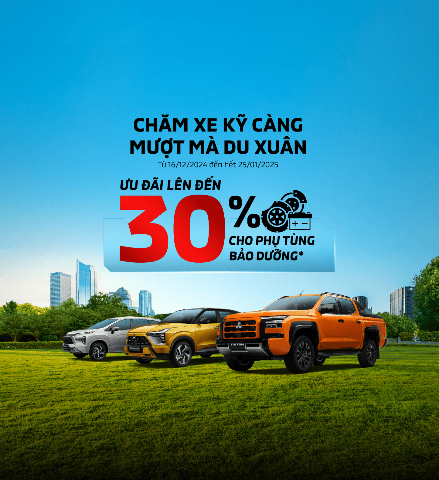 Nhằm phục vụ nhu cầu bảo dưỡng ô tô cho những chuyến du xuân đầu năm, từ 16/12/2024 đến 25/01/2025, Mitsubishi Quảng Ngãi triển khai chương trình ưu đãi phụ tùng và hóa chất chính hãng lên đến 30% khi khách hàng sử dụng dịch vụ và bảo dưỡng xe.