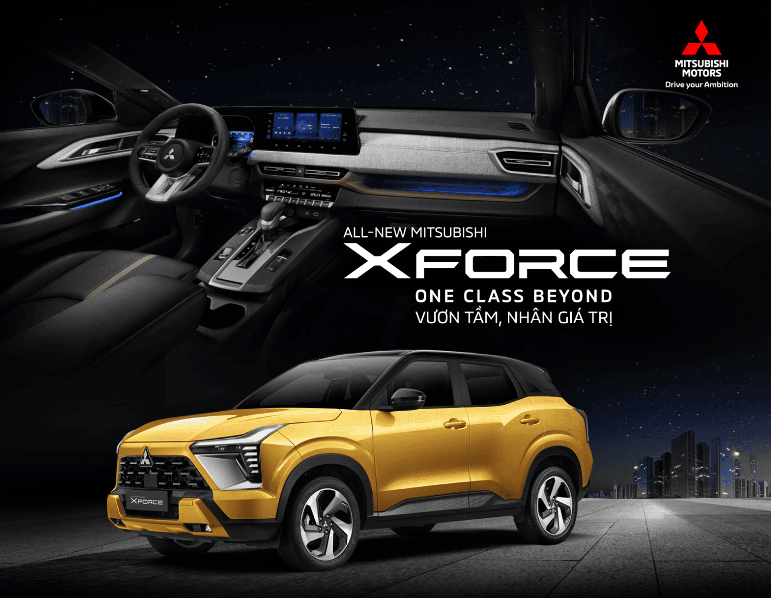 Với định vị “VƯƠN TẦM, NHÂN GIÁ TRỊ”, XFORCE thể hiện nhiều điểm vượt trội trong phân khúc: thiết kế nội, ngoại thất mạnh mẽ, độc đáo. XFORCE sở hữu nhiều điểm vượt trội hàng đầu phân khúc như: màn hình giải trí kích thước lớn 12.3 inch kết hợp cùng đồng hồ thông tin kỹ thuật số 8 inch, điều hoà tự động hai vùng độc lập, chức năng lọc không khí nanoe™X,… Về mặt vận hành, xe trang bị bốn chế độ lái: Đường bình thường, Đường ngập nước, Đường sỏi đá, Đường bùn lầy cho phép người điều khiển tùy chọn với từng điều kiện giao thông thực tế. Đặc biệt, chế độ “Đường ngập nước” lần đầu tiên được Mitsubishi Motors trang bị trên XFORCE, tăng sự an toàn và dễ dàng kiểm soát khi lái xe trong điều kiện mưa hay trơn trượt.