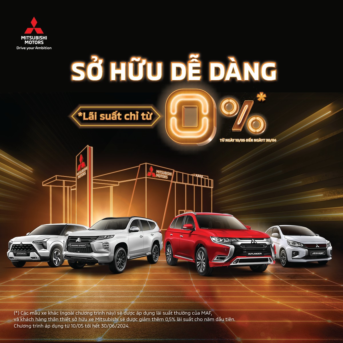 Lưu ý: Các mẫu xe khác (ngoài chương trình này) sẽ được áp dụng lãi suất thường của MAF, và khách hàng thân thiết sở hữu xe Mitsubishi sẽ được giảm thêm 0,5% lãi suất cho năm đầu tiên.